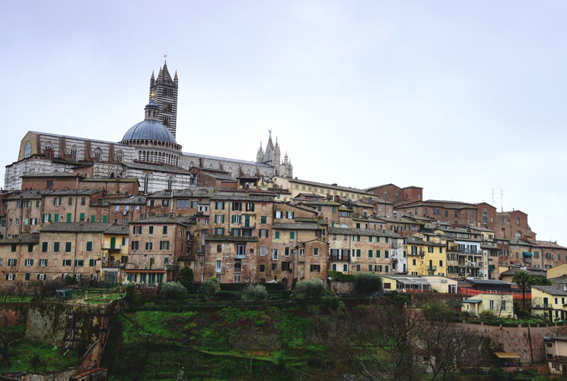 Zwiedzanie Sieny rozpoczynamy od Fortezza Medicea, czyli fortecy Medyceuszy, która zbudowana została w 1563 roku i wokół której obecnie można znaleźć darmowy parking w tym mieście. Warto zapisać 😉 Następnie przechodzimy obok Bazyliki San Domenico, gdzie można podziwiać panoramę średniowiecznej zabudowy Sieny. Spacerując, na przemian w deszczu lub śniegu, po włoskich uliczkach docieramy do jednej z największych atrakcji w Toskanii: Piazza del Campo.